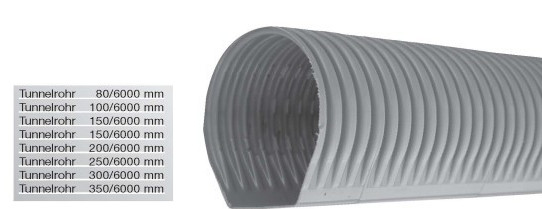 Tunnel-Sickenrohr aus PVC-U quergewellt und geschlitzt, tunnelförmig mit glatter Fließsohle.